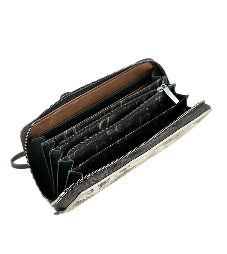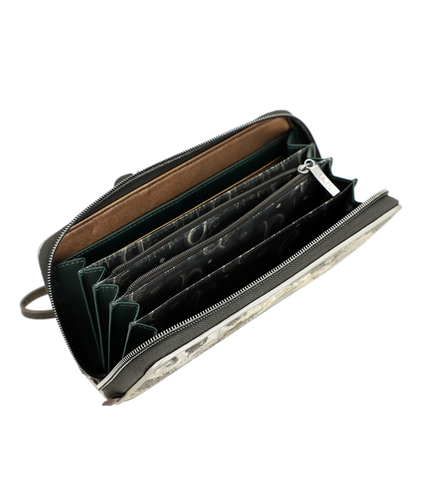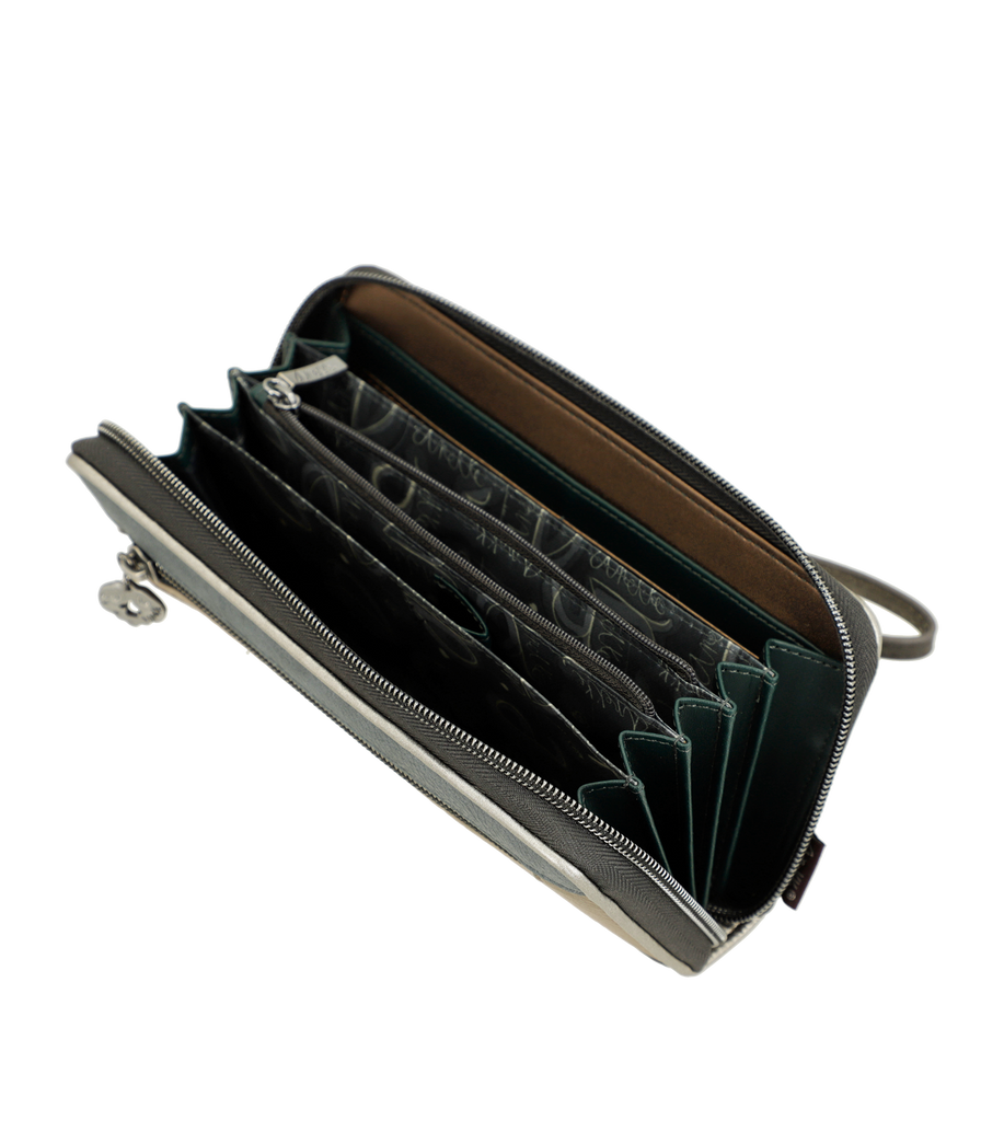 Compartiments : Multiples emplacements pour cartes, poches pour billets, compartiment zippé pour la monnaie.