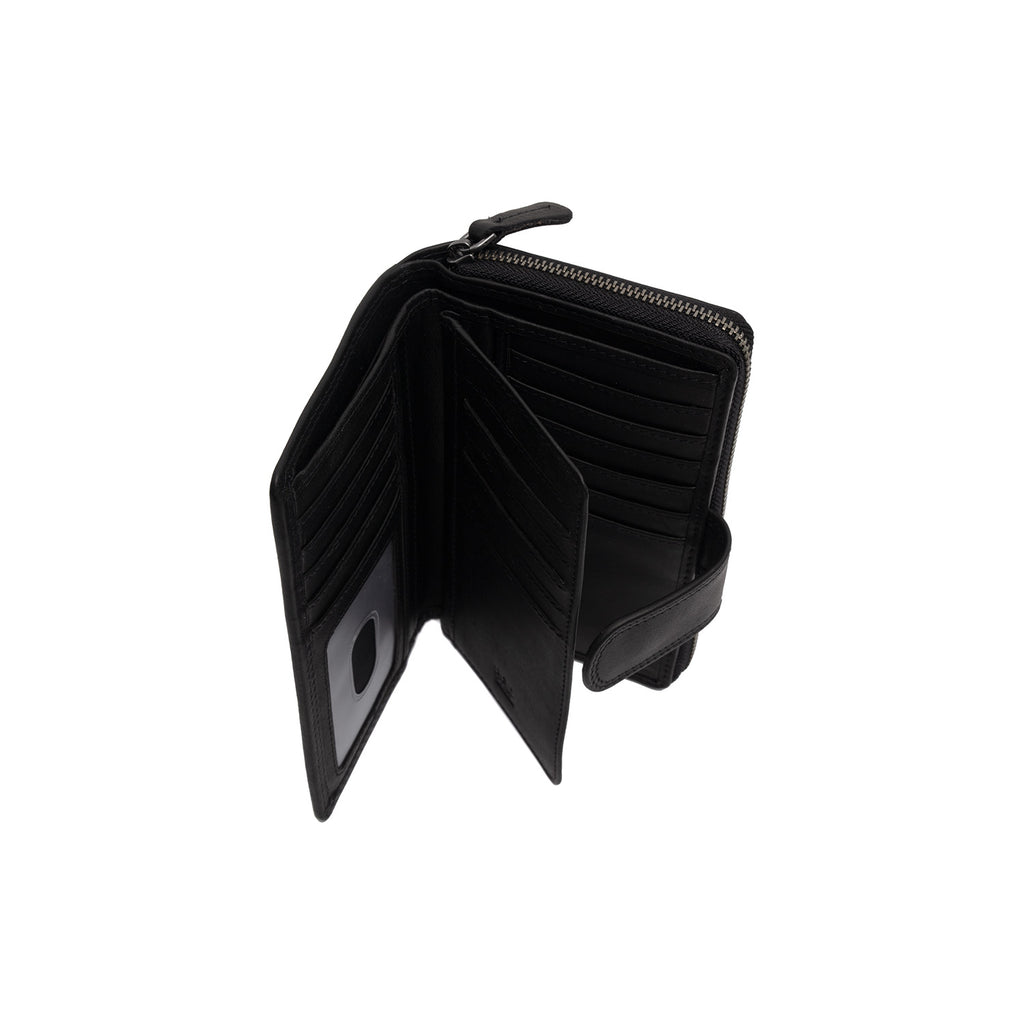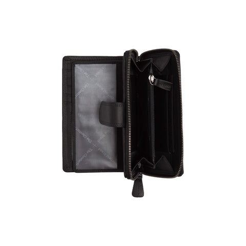 Compartiments : Multiples emplacements pour cartes, poches pour billets, compartiment zippé pour la monnaie et poche transparente pour pièce d’identité.