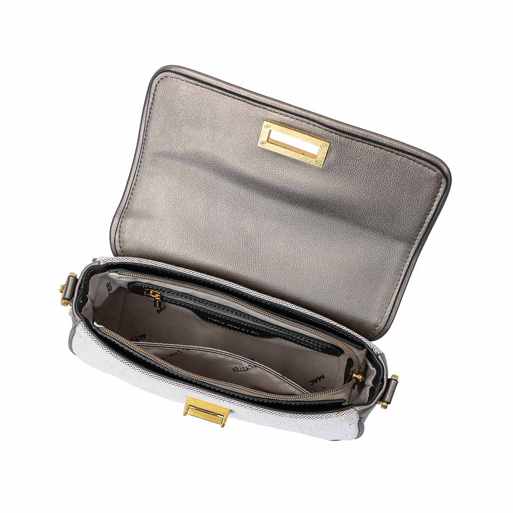 Le sac à main en bandoulière avec rabat de la collection Regard combine élégance classique et détails contemporains. Sa conception harmonieuse permet de transporter vos indispensables avec style, tout en conservant une silhouette épurée.